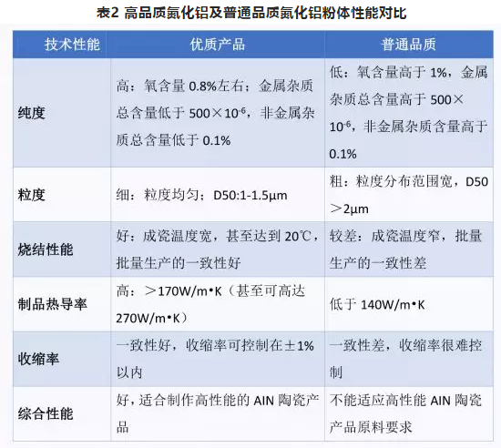 這其中日本德山曹達(dá)公司采用的氧化鋁粉碳熱還原法生產(chǎn)的AIN粉被全球公認(rèn)為質(zhì)量最好,性能最穩(wěn)定,基本占據(jù)了AIN粉市場(chǎng)。日本東芝,京瓷公司,住友電子等大部分基板和封裝都在使用該AIN粉。此外,美國(guó)DOW化學(xué)公司也掌握了氧化鋁粉碳熱還原法生產(chǎn)AIN粉技術(shù)。日本東洋鋁公司則采用成本相對(duì)較低的鋁粉直接氮化法生產(chǎn)AIN粉,性能也挺好,熱導(dǎo)率也能穩(wěn)定在170W/m•K以上。優(yōu)質(zhì)的AIN粉及品質(zhì)一般的氮化鋁粉的區(qū)別見下表分析。