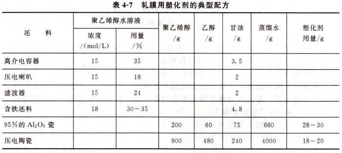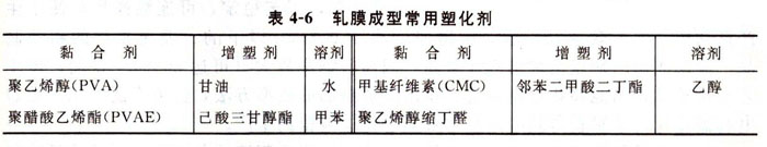軋膜成型(sheet forming)也屬于可塑法成型。將準備好的坯料拌以一定量的有機塑化劑,使之具有可塑性。塑化劑是由黏合劑、增塑劑、溶劑、消泡劑等配制而成。黏合劑要求有足夠的黏合力、較好的成膜性能(良好的延展性和韌性),并具有燒后灰分少、無毒性的特點。增塑劑所起的作用是插入高分子化合物的鏈段之間,減弱相互之間吸引力,使黏合劑受力變形后不致出現(xiàn)彈性收縮和破裂,從而提高坯料的可塑性。溶劑的主要作用是溶解黏合劑和增塑劑。軋膜成型常用的黏合劑、增塑劑和溶劑列于表4-6中。