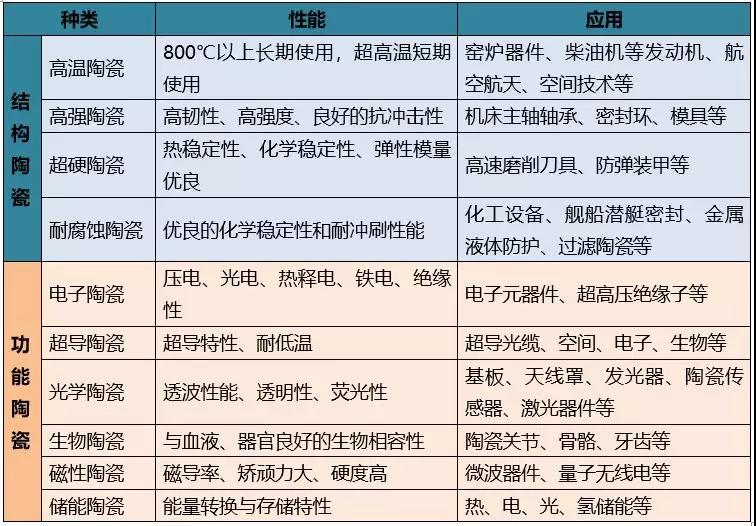 按性能和用途,先進陶瓷可分為功能陶瓷和結構陶瓷兩大類。功能陶瓷主要基于材料的特殊功能,具有電氣性能、磁性、生物特性、熱敏性和光學特性等特點,主要包括絕緣和介質陶瓷、鐵電陶瓷、壓電陶瓷、半導體及其敏感陶瓷等;結構陶瓷主要基于材料的力學和結構用途,具有高強度、高硬度、耐高溫、耐腐蝕、抗氧化等特點,主要包括氧化物陶瓷、氮化物陶瓷、碳化物陶瓷、硼化物陶瓷等。